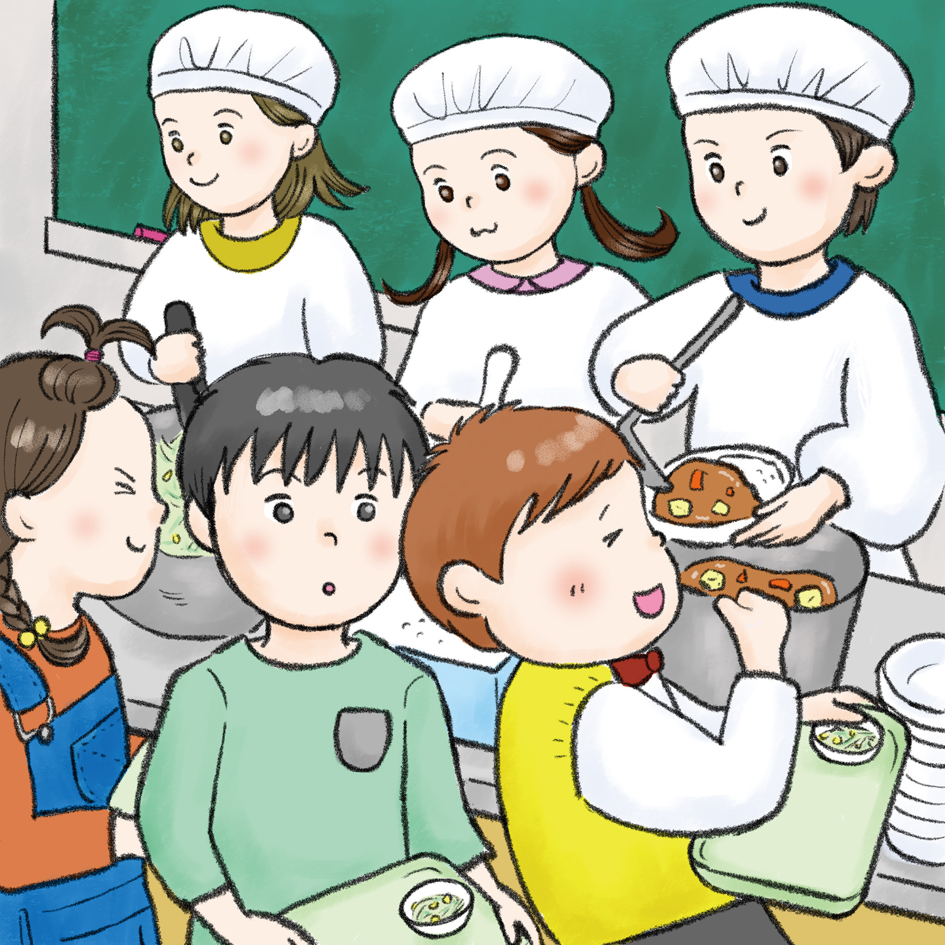 カレーライスがテーマのまちがい絵さがしのイラストです。カレーライス大盛りでお願いします、オッケーです、と無事にカレーライス大盛りをゲットした男の子がこのイラストの主人公で、周りのキャラを考えて構図を決めていきました。